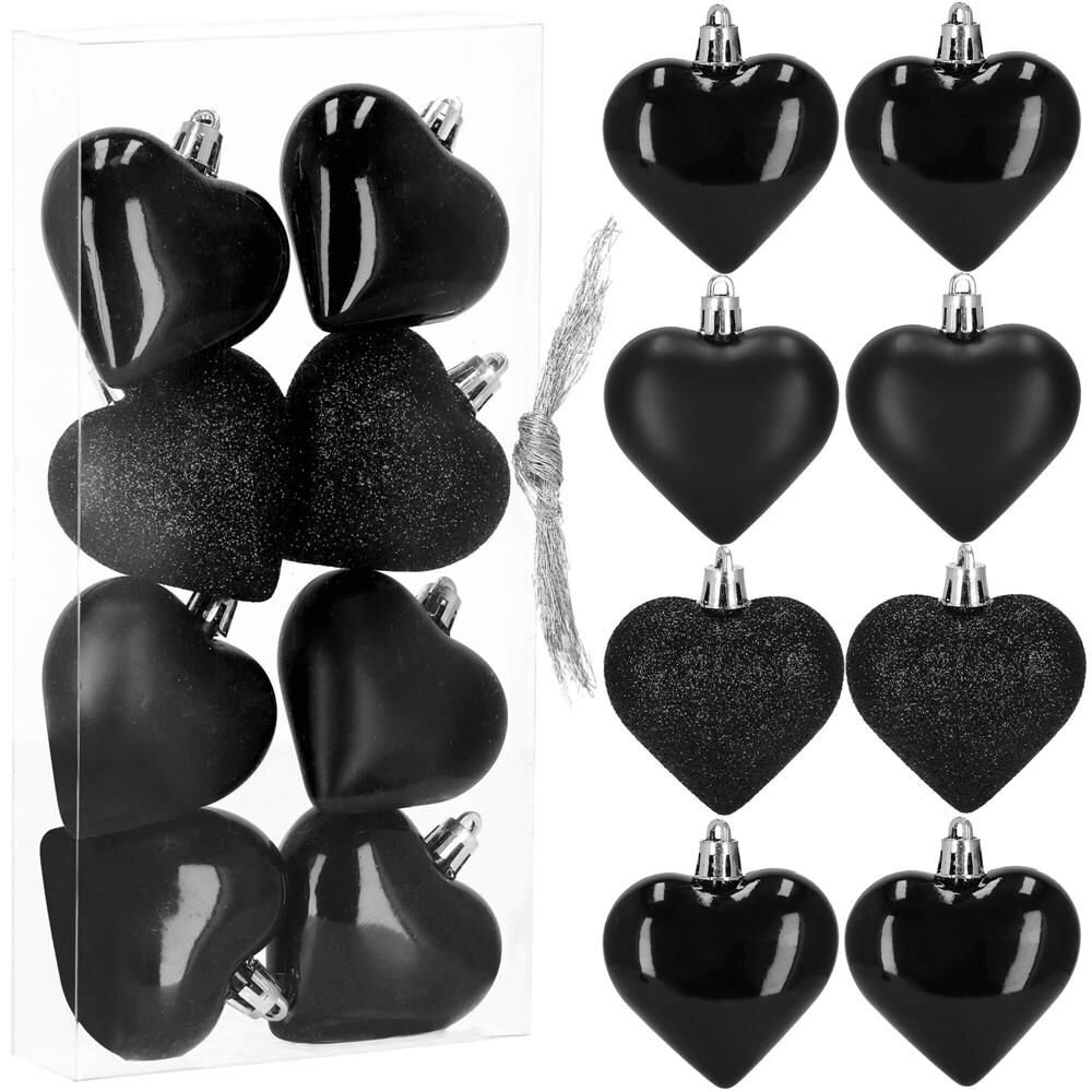 Sada 8 ks černých ozdob na stromeček s motivem srdce. Výška ozdoby 7 cm, se třemi vzory, poutko na zavěšení, nerozbitný plastový materiál. Ideální k výzdobě stromečku nebo jako vánoční dekorace. Zdarma provázky pro snadné zavěšení. číst celé