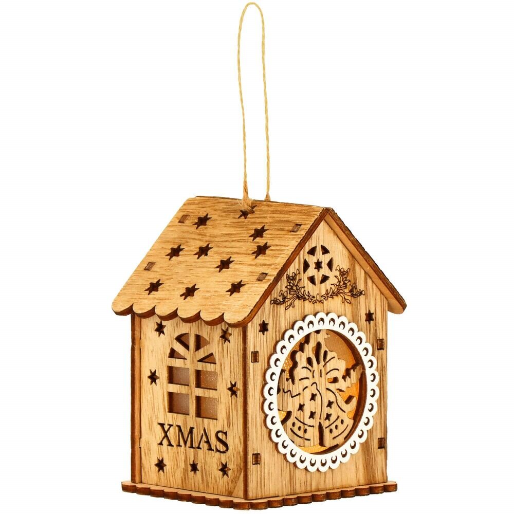 Krásně vyřezávaná dřevěná ozdoba s motivem domečku se zvonky, která díky jemnému osvětlení vytváří hřejivou atmosféru. Vybavena poutkem pro snadné zavěšení, je ideální na vánoční stromeček či jako dekorace do interiéru. Výška 9 cm.