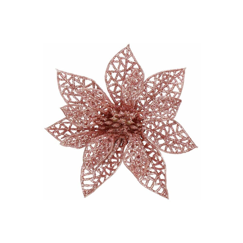 Umělá vánoční hvězda s klipem dokonale doplní vánoční výzdobu. Detailně prolamovaný květ se třpytkami a umělým sněhem vytváří jedinečný efekt námrazy. Díky spodnímu klipu se snadno připevňuje. Velikost 9x9 cm, růžová barva.