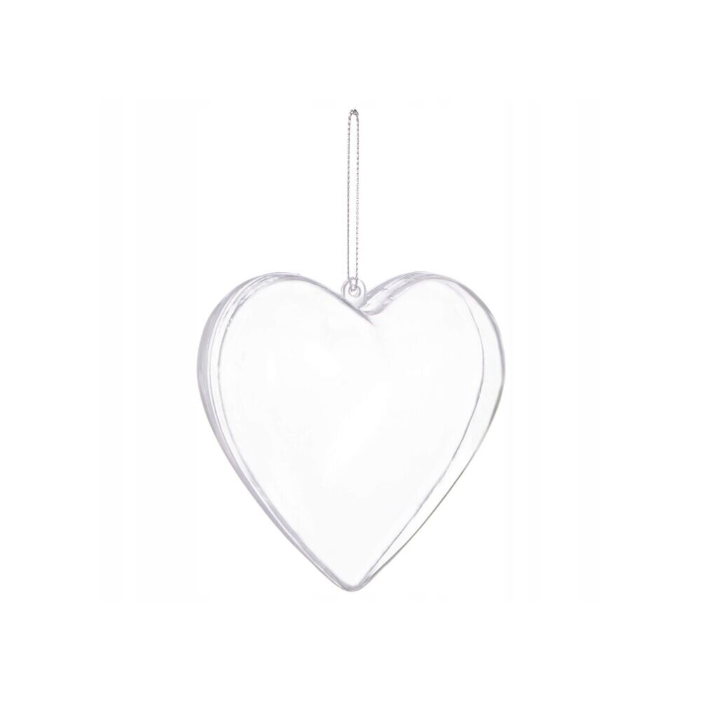 Průhledná plastová baňka ve tvaru srdce s možností vytvoření originální ozdoby. Ozdobte si vánoční baňku na stromeček dle svých představ. Průměr 6 cm, nerozbitný plastový materiál, poutko a provázek na zavěšení.