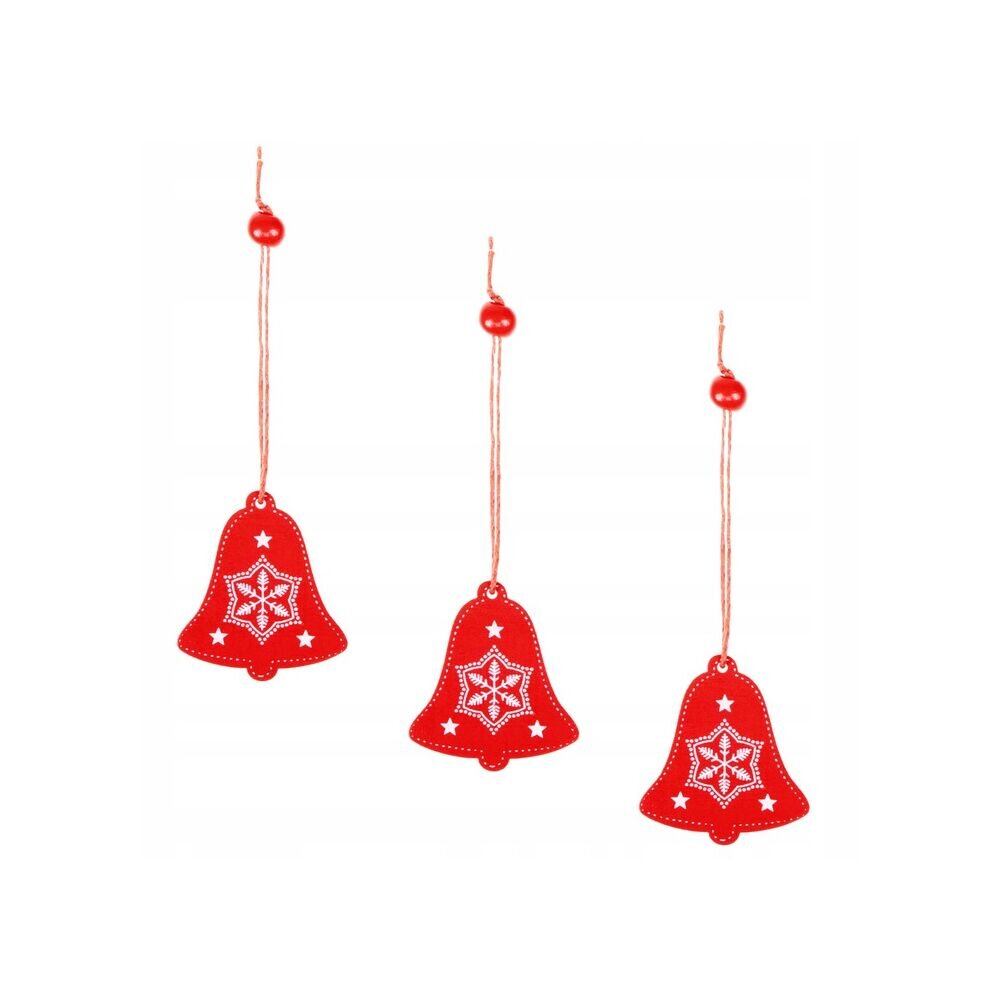 Sada tří kusů dřevěných zvonků s bílými vločkami a provázkem na zavěšení. Výška 4,9 cm, přírodní materiál. Ideální k výzdobě stromečků nebo jako vánoční dekorace.
