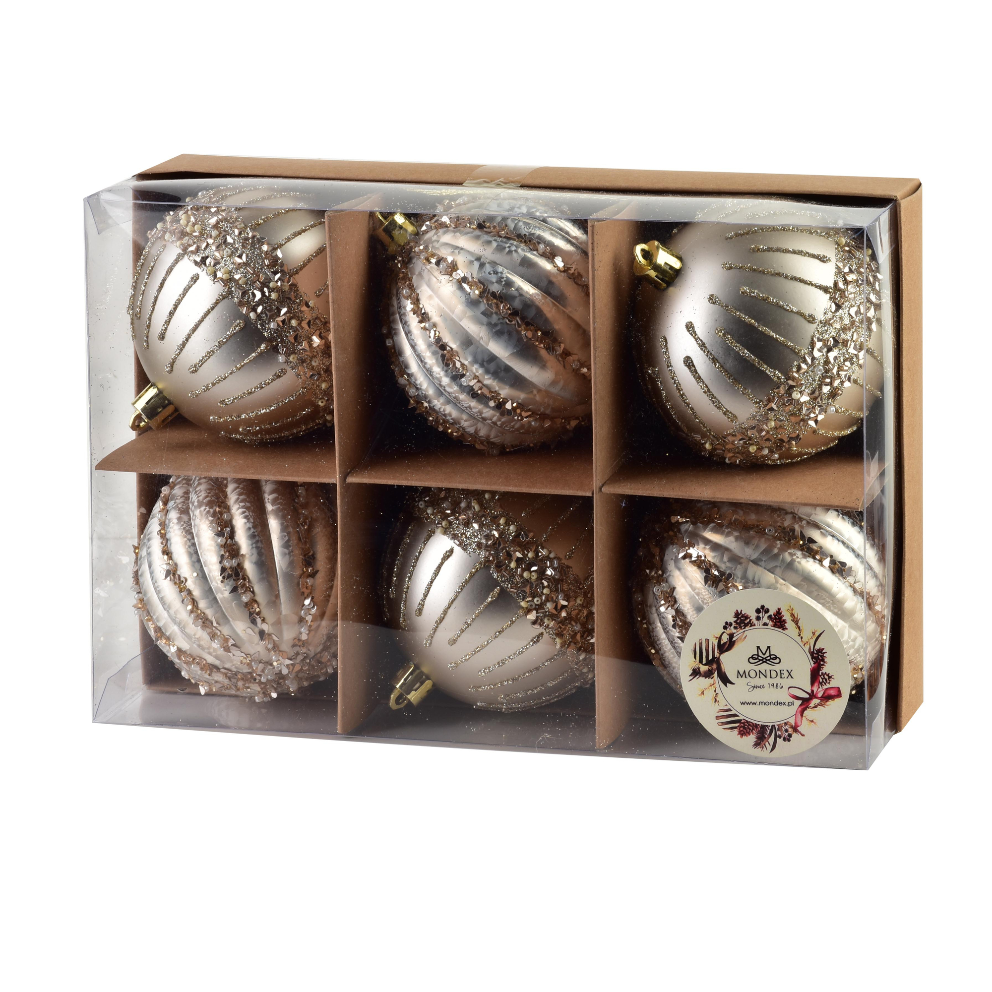 SANTA LILA Komplet 6 bombek w kolorze szampańskimSzlachetność i blask w świątecznym wydaniuDodaj swojej choince wyjątkowego charakteru dzięki zestawowi bombek SANTA LILA w eleganckim, szampańskim kolorze. Ten komplet łączy klasykę z subtelnym blaskiem, tworząc dekorację, która zachwyci domowników i gości.Najważniejsze cechy i korzyści:Szampański odcień . subtelny luksusDelikatna, połyskująca barwa idealnie komponuje się z tradycyjnymi i nowoczesnymi aranżacjami świątecznymi, nadając wnętrzu elegancji i ciepła.Komplet 6 sztuk . harmonijna dekoracjaZestaw gotowy do udekorowania choinki, wieńca lub stroików . gwarantuje spójny i estetyczny efekt.Starannie wykonane detaleKażda bombka wykonana z dbałością o jakość i trwałość . lekka, ale solidna, odporna na przypadkowe stłuczenie.Uniwersalny stylPasuje zarówno do aranżacji glamour, klasycznych, jak i minimalistycznych . ponadczasowa forma i kolorystyka.Idealne na prezentEleganckie opakowanie sprawia, że zestaw świetnie nadaje się jako upominek świąteczny.