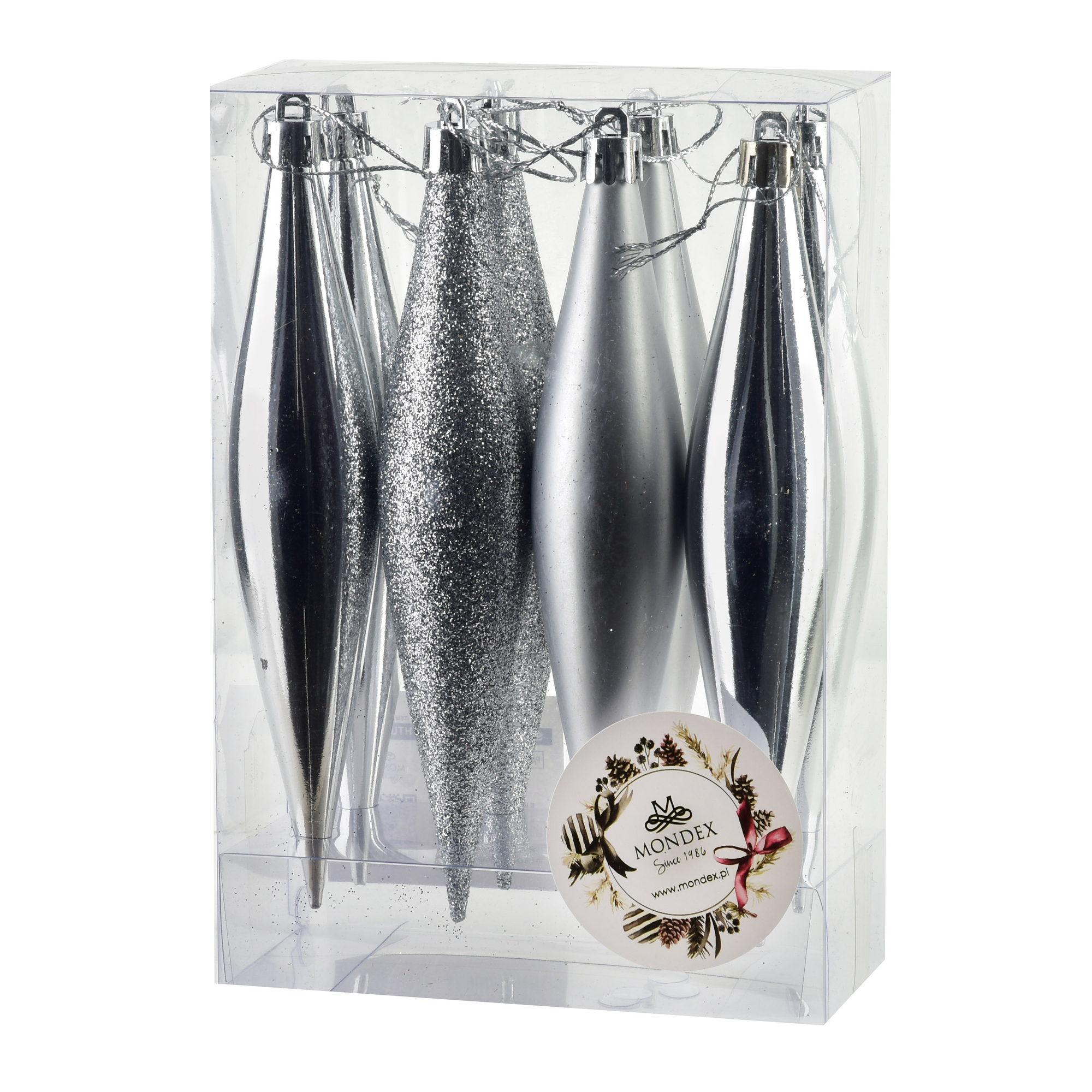Komplet 8 bombek w kształcie sopla. Srebrny blask Twojej choinki Stwórz magiczną atmosferę świąt dzięki zestawowi 8 bombek w kształcie sopla, wykonanych z trwałego PVC i wykończonych w eleganckim, srebrnym kolorze. Te lekkie,a zarazem efektowne ozdoby nadadzą Twojemu drzewku wyjątkowego charakteru i blasku. Korzyści, które docenisz: Srebrny kolor . symbol świątecznego luksusu Klasyczny, ciepły odcień złota pięknie odbija światło lampek choinkowych i tworzyprzytulny klimat. Kształt sopla . subtelna elegancja Smukłe, zwisające bombki w formie sopli optycznie wydłużają choinkę i dodają dekoracji lekkości. Wytrzymałe PVC . bezpieczne i praktyczne Idealne dla rodzin z dziećmi i zwierzętami . lekkie, nietłukące się i odporne na uszkodzenia. Zestaw 8 sztuk. Gotowa dekoracja Wystarczy kilka chwil, by nadać drzewku spójny, elegancki wygląd. Uniwersalne mocowanie Każda bombka wyposażona w zawieszkę . gotowa do powieszenia zaraz po wyjęciu z opakowania.