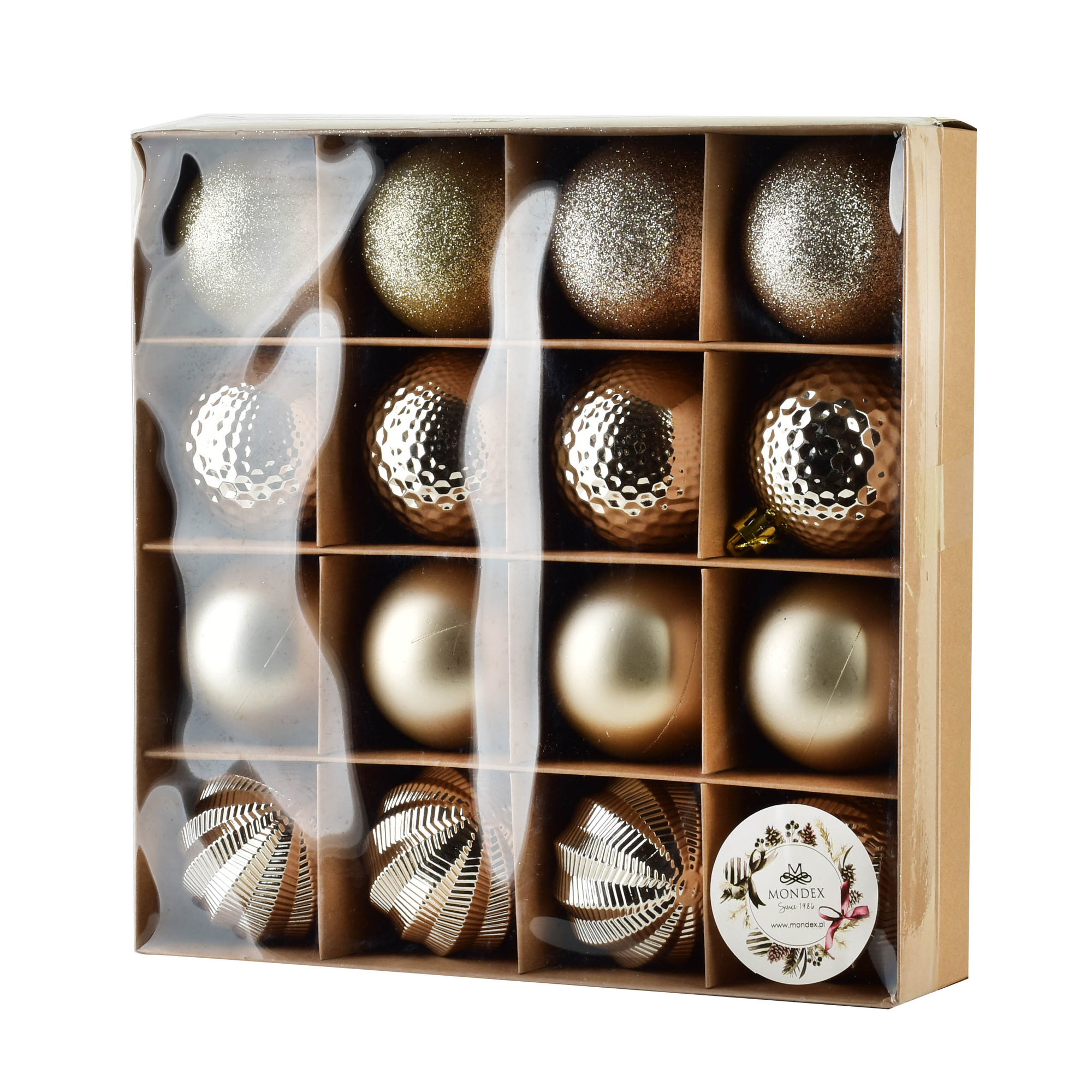 SANTA LILA. Komplet 16 bombek w kolorze złotymSzlachetność i blask w świątecznym wydaniuDodaj swojej choince wyjątkowego charakteru dzięki zestawowi bombek SANTA LILA w eleganckim, złotym kolorze. Ten komplet łączy klasykę z subtelnym blaskiem, tworząc dekorację, która zachwyci domowników i gości.Najważniejsze cechy i korzyści:Szampański odcień . subtelny luksusDelikatna, połyskująca barwa idealnie komponuje się z tradycyjnymi i nowoczesnymi aranżacjami świątecznymi, nadając wnętrzu elegancji i ciepła.Komplet 6 sztuk . harmonijna dekoracjaZestaw gotowy do udekorowania choinki, wieńca lub stroików . gwarantuje spójny i estetyczny efekt.Starannie wykonane detaleKażda bombka wykonana z dbałością o jakość i trwałość . lekka, ale solidna, odporna na przypadkowe stłuczenieUniwersalny stylPasuje zarówno do aranżacji glamour, klasycznych, jak i minimalistycznych . ponadczasowa forma i kolorystyka.Idealne na prezentEleganckie opakowanie sprawia, że zestaw świetnie nadaje się jako upominek świąteczny.