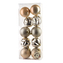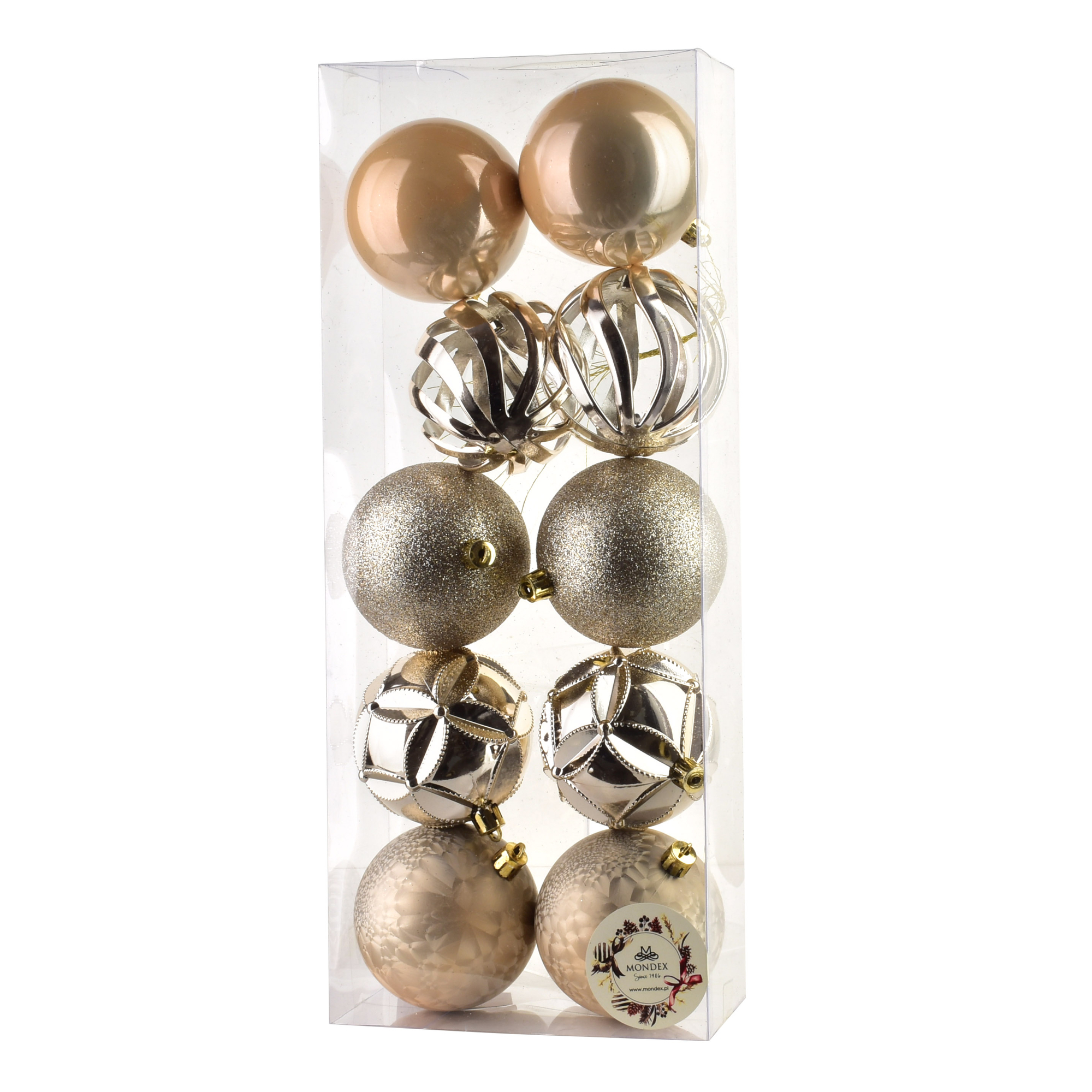 Komplet 10 bombek świątecznych SANTA LILA o średnicy 7,5 cm w kolorze szampańskim to elegancka i stylowa propozycja dekoracyjna, idealna do klasycznych oraz nowoczesnych aranżacji bożonarodzeniowych. Bombki wykonane są z lekkiego, trwałego tworzywa sztucznego, które imituje szkło, ale jest odporne na stłuczenia . co czyni je doskonałym wyborem do domów z dziećmi i zwierzętami.Szampański kolor łączy w sobie subtelność beżu i ciepłego złota, dzięki czemu wprowadza do wnętrza delikatny blask i elegancki nastrój. Zestaw najczęściej obejmuje bombki w różnych wariantach wykończenia . błyszczące, matowe i brokatowe . co pozwala na stworzenie efektownej, wielowymiarowej kompozycji na choince.Dzięki większemu rozmiarowi 7,5 cm bombki świetnie prezentują się na średnich i dużych drzewkach, nadając im dekoracyjnej głębi i wyrazistości. Cały komplet zapakowany jest w estetyczne przezroczyste pudełko z PVC, które ułatwia przechowywanie i chroni ozdoby przed uszkodzeniem.Komplet bombek SANTA LILA w kolorze szampańskim to idealny wybór dla osób poszukujących subtelnej, ale efektownej dekoracji świątecznej, która doda wnętrzu elegancji, ciepła i świątecznego blasku. Świetnie komponuje się z bielą, zielenią, srebrem i pastelowymi dodatkami.
