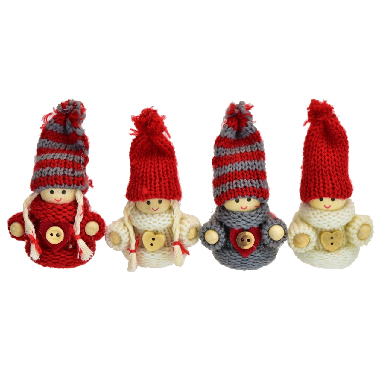 Pletené panenky v barevné kombinaci červené, šedé a krémové jsou dokonalým doplňkem do vašeho interiéru. Těchto krásných 8 cm panenek je k dispozici 4 ks, které můžete zavěsit na různá místa, jako jsou poličky nebo věšáčky. Jsou vyrobeny z kvalitních materiálů, jako je úplet, dřevo a papír, což zaručuje jejich dlouhou životnost. Díky tomuto unikátnímu designu jsou panenky nejen krásným dekoračním prvkem, ale také skvělým dárkem pro vaše blízké.