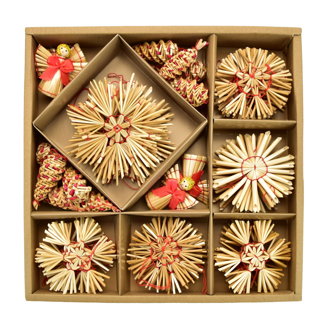 Přidejte do svého vánočního prostředí přírodní a rustikální atmosféru s těmito krásnými slaměnými vánočními ozdobami. Tato sada obsahuje celkem 50 kousků ozdob, které jsou ručně vyrobené a každou z nich najdete v jedinečném designu. Každá ozdoba je zhotovena ze slaměného materiálu s prošíváním v červené barvě, což dodává vánočnímu stromku nebo jinému vánočnímu dekoru ten správný vánoční lesk a eleganci.