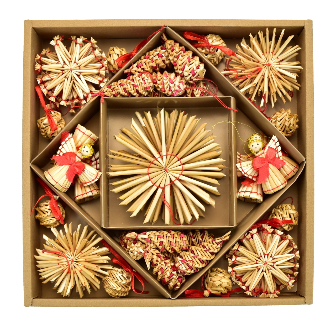 Slaměné ozdoby s červeným dekorem, 56 ks