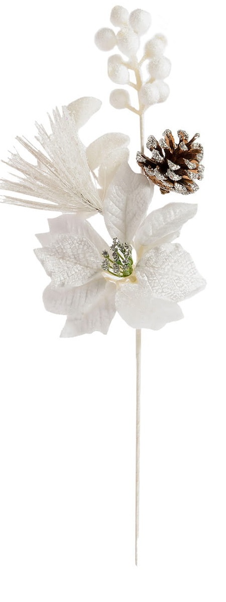 Zimowa gałązka na druciku w kolorze białym z kwiatem gwiazdy betlejemskiej oraz elementami dekoracyjnymi o długości 49 cm to idealna ozdoba, która doda świątecznego blasku każdej aranżacji. Dzięki swojej elegancji i wszechstronności, stanowi doskonały dodatek do świątecznych dekoracji,...