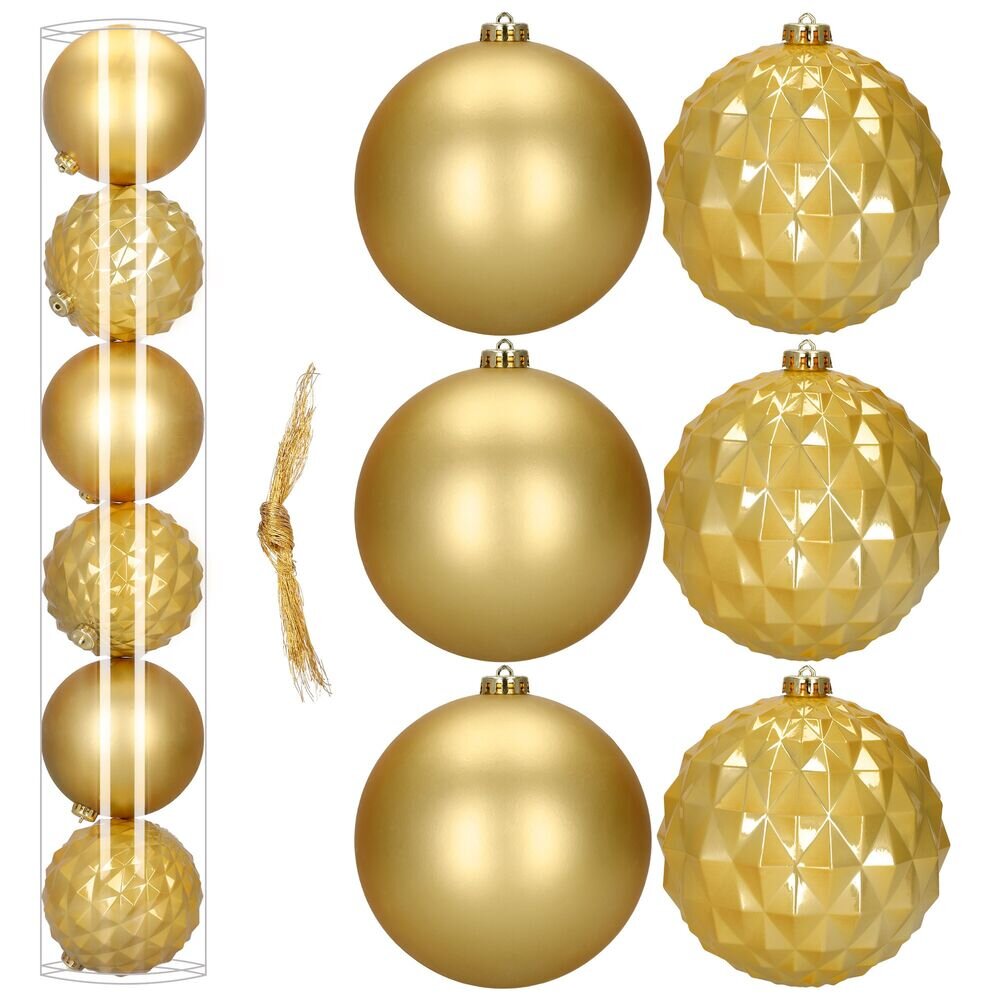 Vánoční baňky zlaté - 15 cm sada 6 ks dodají každé sváteční výzdobě luxusní a harmonický vzhled. Kombinace matného a lesklého povrchu vytváří efektní kontrast, který krásně doplní vánoční stromeček, věnec i různé dekorace. Baňky jsou vyrobeny z lehkého a pevného plastu, takže se snadno s nimi manipuluje a nehrozí jejich rozbití. Odolnost proti nárazům z nich dělá ideální volbu i do domácností s dětmi či mazlíčky.