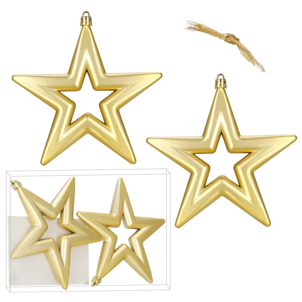 Zlaté vánoční hvězdy z lehkého, nerozbitného plastu dodají stromku elegantní a zářivý vzhled. Díky páskům pro zavěšení je lze snadno umístit nejen na stromeček, ale i na další vánoční dekorace. Jsou vhodné pro vnitřní i venkovní použití. Výška hvězdy je 14,5 cm.