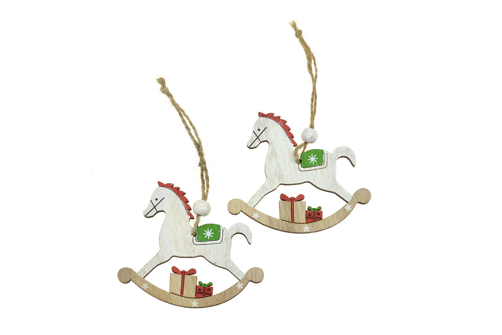 Dekorace houpací koník v sadě po 2 ks v balení. Dekorace je vyrobena ze dřeva a z jedné strany je malovaná. Koník je na přírodním provázku opatřenehé korálkem.