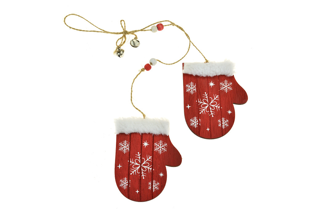 Závěsná vánoční dřevěná dekorace, rukavice s umělým plyšem 2 ks
