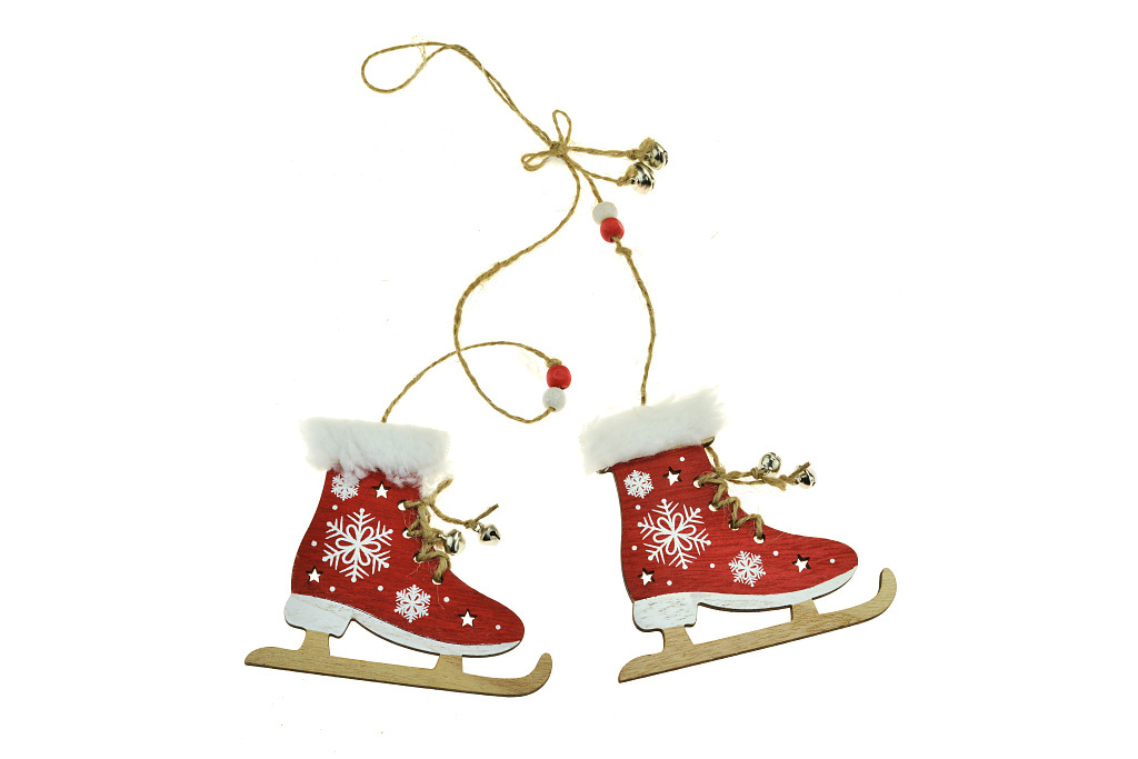 Závěsná vánoční dřevěná dekorace, brusle s umělým plyšem 2 ks