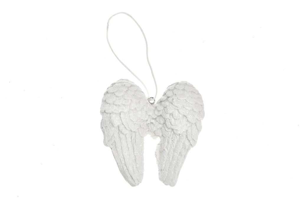 Krásná dekorace vyrobená z pryskyřice v podobě nádherné závěsné dekorace bílých andělských křídel, která mají díky glitrům jiskřivý efekt při dopadu světla.