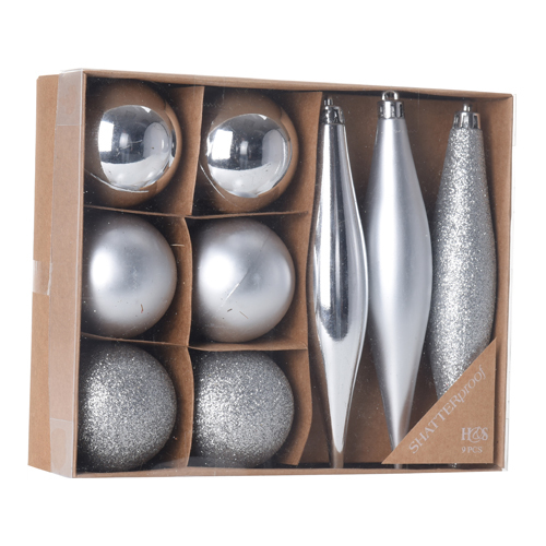 Sada vianočných ozdôb (9 ks):- 6 ks vianočné gule 50 mm (2 lesklé, 2 matné, 2 s trblietkami)- 3 ks vianočné cencúle 150 mm (lesklý, matný, s trblietkami)Farba: strieborná.