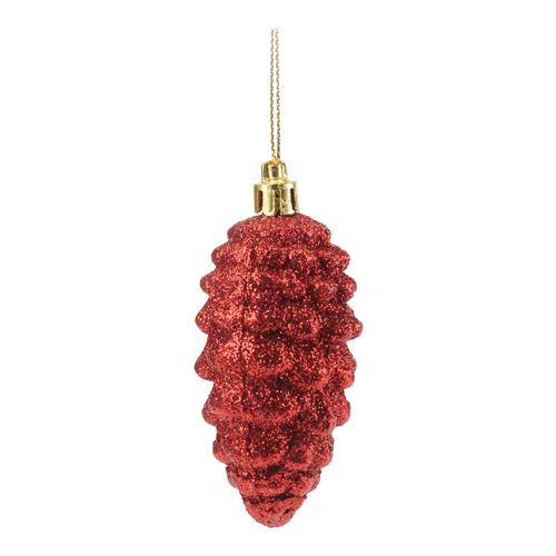 Vánoční ozdoba, závěsná ozdoba ve tvaru jedlové šišky, v červené třpytivé barvě. Baleno v plastové krabičce po 8 kusů. Materiál: polystyren.