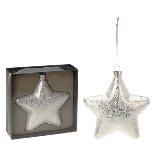Vianočná dekorácia, závesná v tvare hviezdy. Strieborná, s plastovými trblietkami, ktoré vytvárajú dojem umelého snehu. Vyhotovené zo skla. Rozmer ozdoby 15cm. Luxusná dekorácia na Váš vianočný stromček. číst celé