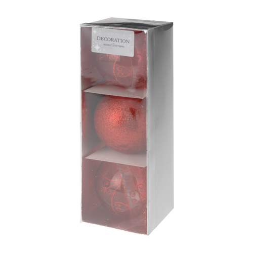 Vianočná závesná ozdoba, vyhotovená z pevného PP materiálu. V červenej farbe/mix - hladká, leská s trblietkami. Priemer ozdoby 80mm. Praktické, nerozbitné, napriek tomu s luxusným vzhľadom. Sada obsahuje 3 ks. Materiál: plast.