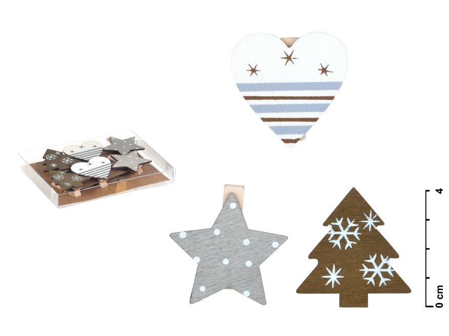 Vánoční, dřevěné kolíčky. Vhodné na kreativní tvoření, na připnutí fotky nebo dokumentu. Dekorace je připevněna ke kolíčku a můžete ji kdekoliv připnout. Ozdoba je vyrobena z překližky.