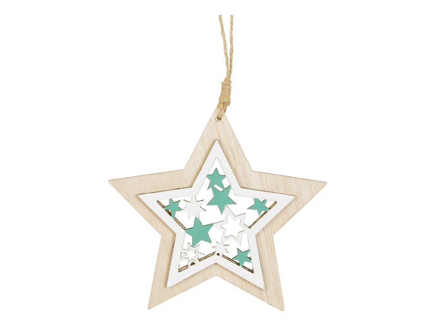 Vánoční dřevěná dekorace hvězda se závěsem. Krásná, vánoční dekorace vyrobena ze dřeva s provázkem, který umožňuje snadné zavěšení. Lze použít na různé dekorace jako zavěsit na dveře či okno. Dřevěné ozdoby mají tu výhodu, že se při pádu hned nerozbijí a můžete si tak zkrášlit vaše bydlení.
