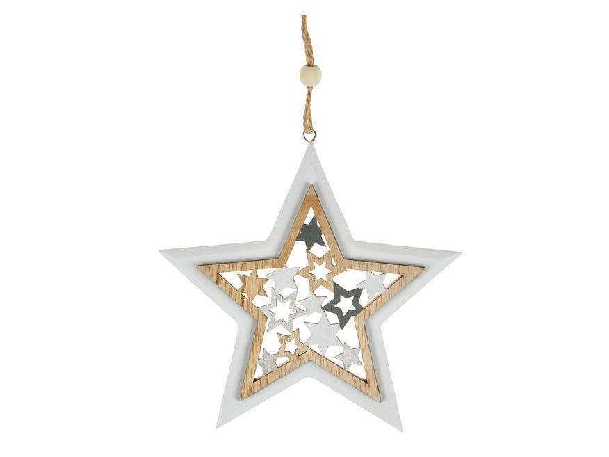 Dřevěná vánoční dekorace ve tvaru hvězdy se závěsem. Tato dekorace je opatřena očkem a provázkem s korálkem na zavěšení. Ideální na zavěšení do okna nebo jako vánoční ozdoba.