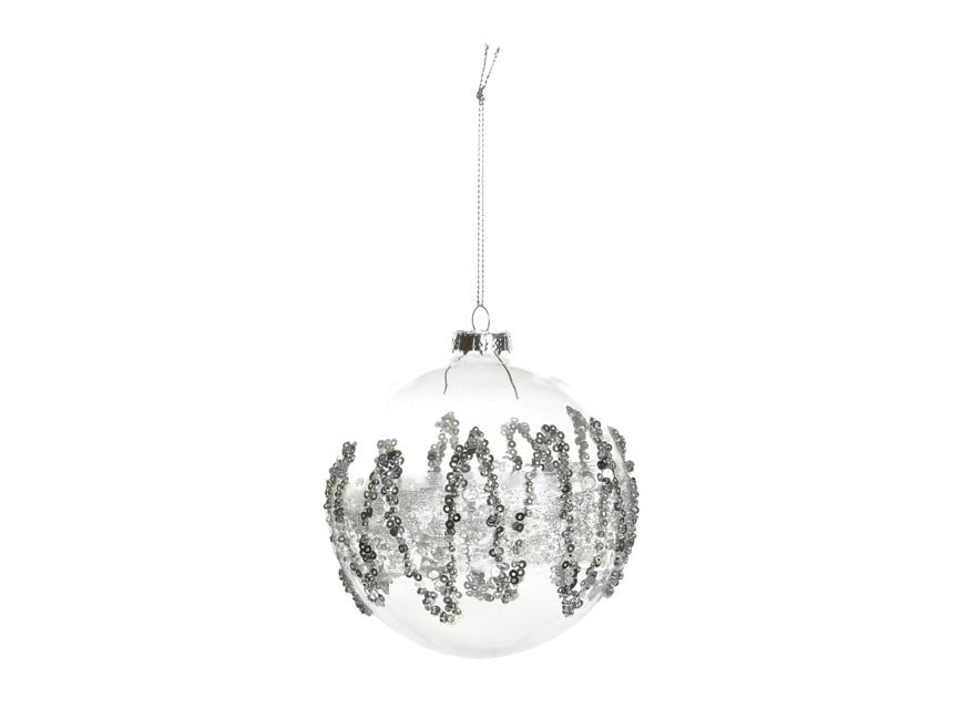 Čirá, skleněná baňka na vánoční stromeček se stříbrným dekorem. Tato vánoční ozdoba je ideální jako výzdoba do interiérů. Baňka je opatřena šňůrkou na zavěšení.
