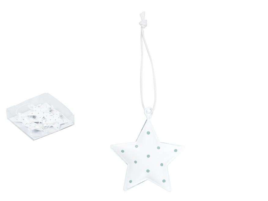 Vánoční dekorace z kovu ve tvaru hvězdy. Tato ozdoba je v bílé barvě se zelenými puntíky a je opatřena provázkem pro snadné zavěšení. Vánoce jsou svátky pohody a klidu, a proto je potřeba se na ně pořádně připravit. Vyzdobte si domov touto krásnou kovovou dekorací, která Vám navodí pocit přicházejících Vánoc.