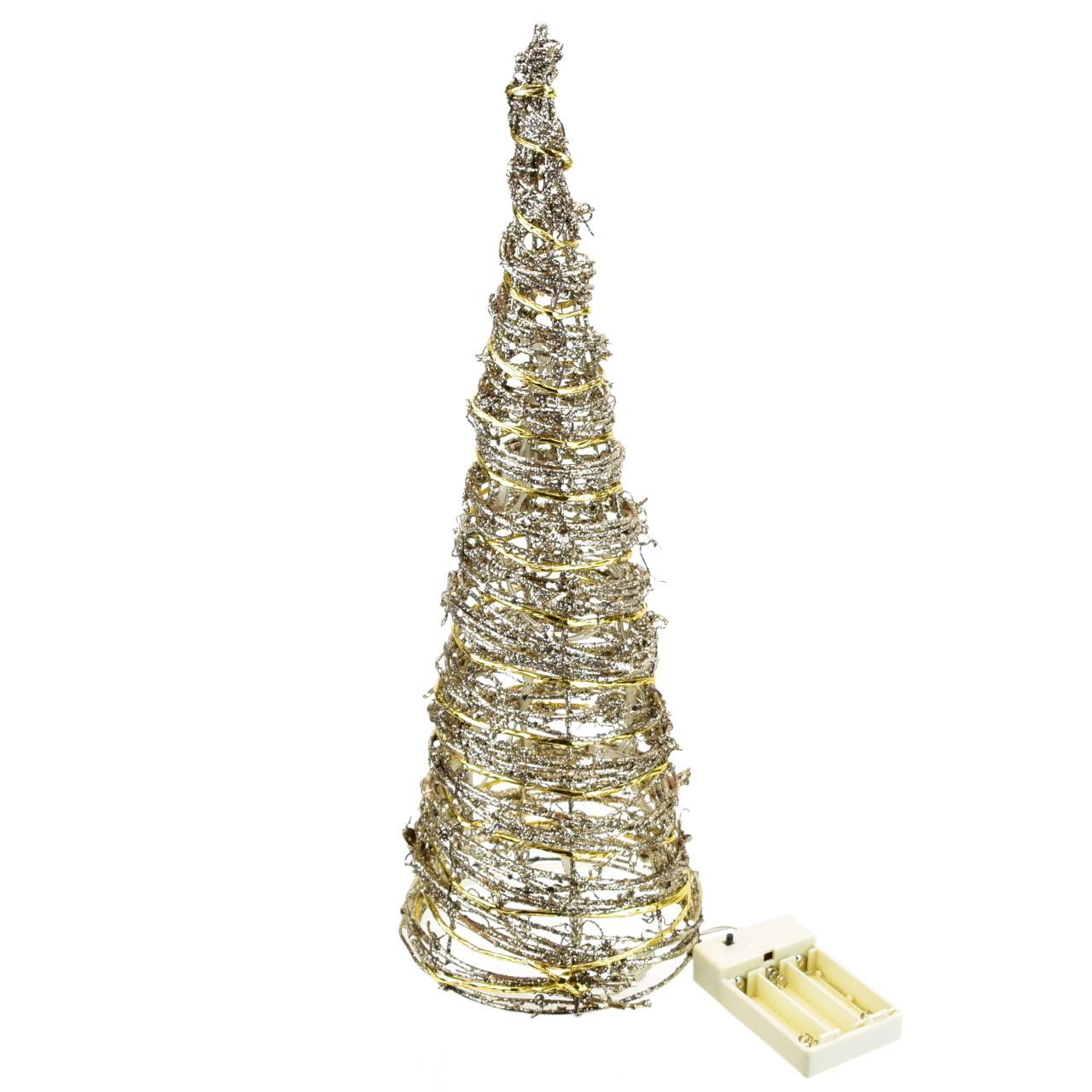 Drátěný ratanový kužel ve zlaté barvě s glitrem a s 10 LED žárovičkami. (Napájení: 3x AA baterie, nejsou součástí balení)