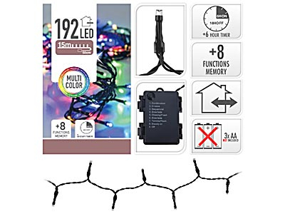 ŁAŃCUCH LED 192 WIELOKOLOROWE 15M8-FUNKCJI ŚWIECENIA,TIMER 3x AA 1,5V NA BATERIE WW ZEWNĘTRZE