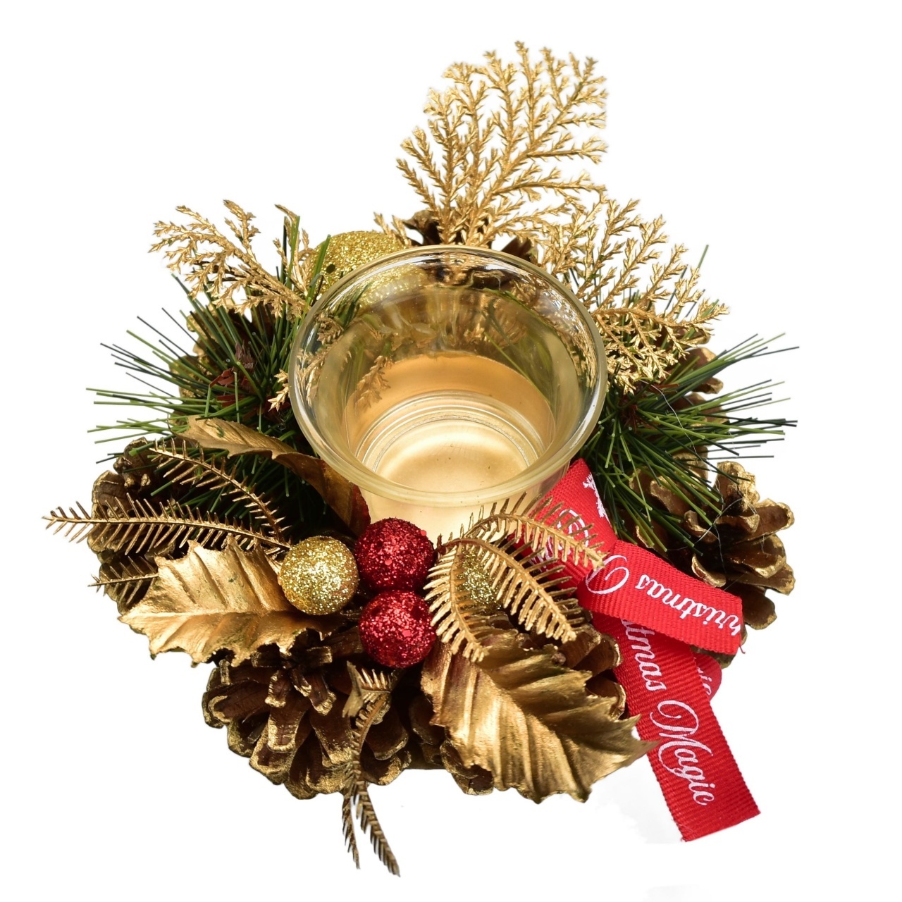 Oživte svou vánoční atmosféru s naším svícnem šiškovým zlatým o průměru 15 cm. Tento jedinečný svícen je vyroben z pozlacených šišek, které spolu s zlatými větvičkami a elegantními kuličkami vytvářejí dokonalou harmonii. Každý svícen je doplněn stylovou červenou mašlí a autentickými borovicovými větvičkami, což dodává na pravé vánoční atmosféře. Design svícnu je nejen atraktivní, ale také praktický, neboť obsahuje skleničku vhodnou pro čajovou svíčku, která zajistí dlouhotrvající světlo a teplo váš domov během sváteční sezóny.