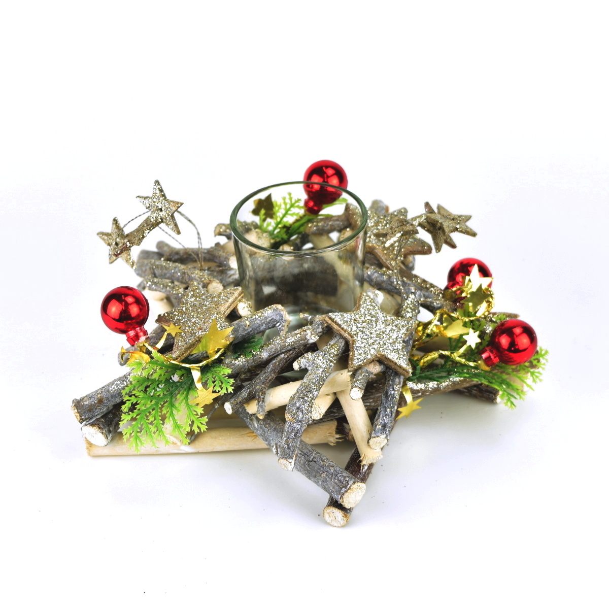 Ratanový svícen na čaj.svíčku ozdobený hvězdami a hvězdičkami barvy champagne s glitrem. číst celé