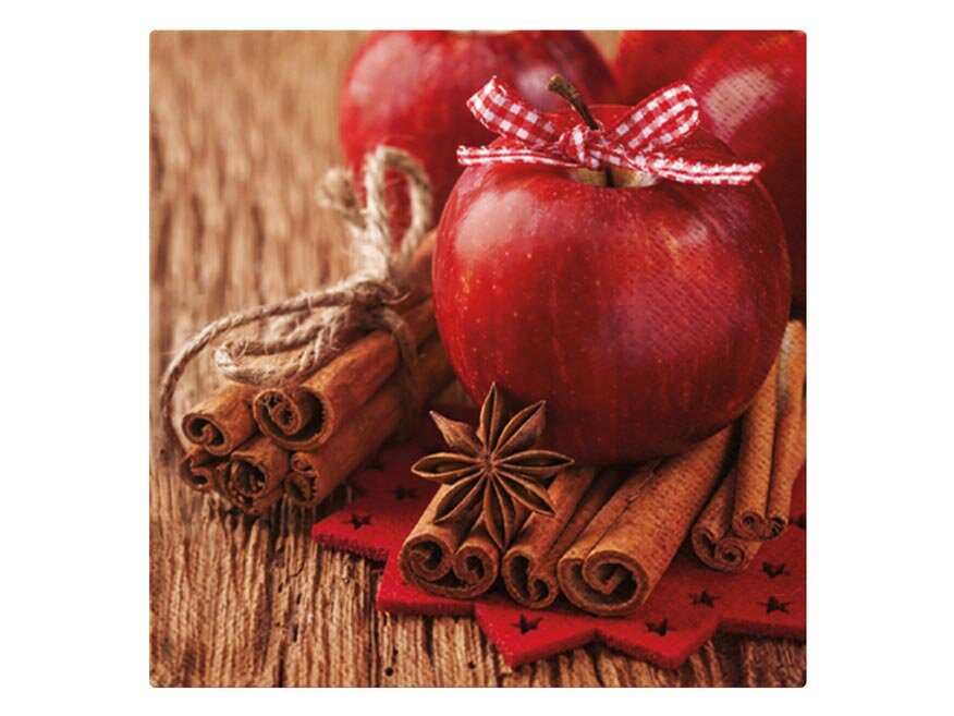 Papírový vánoční ubrousek s motivem jablíček a skořice. Je vyroben z velmi kvalitního třívrstvého papíru. Tento ubrousek se skvěle hodí na stůl během vánočních svátků, kdy jeho dekorativní prvky doplní vaši slavnostní výzdobu. Je ideální pro servírování horkých nápojů, svařeného vína nebo svátečních jídel.