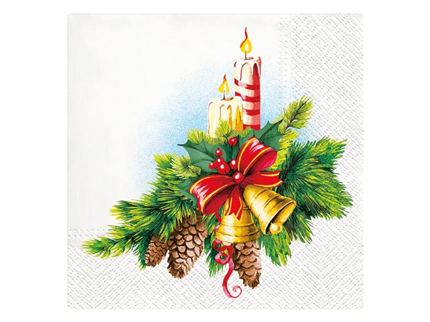 Papírový vánoční ubrousek s motivem vánočního svícnu z větviček jehličí a šišek, ozdobený zlatými zvonky s červenou mašlí a dvěma svíčkami. Je vyroben z velmi kvalitního třívrstvého papíru. Tento ubrousek se hodí pro vánoční slavnosti, kde jeho tradiční symboly a barevná kombinace přispějí k vytvoření příjemné a hřejivé atmosféry na slavnostně prostřeném stole.