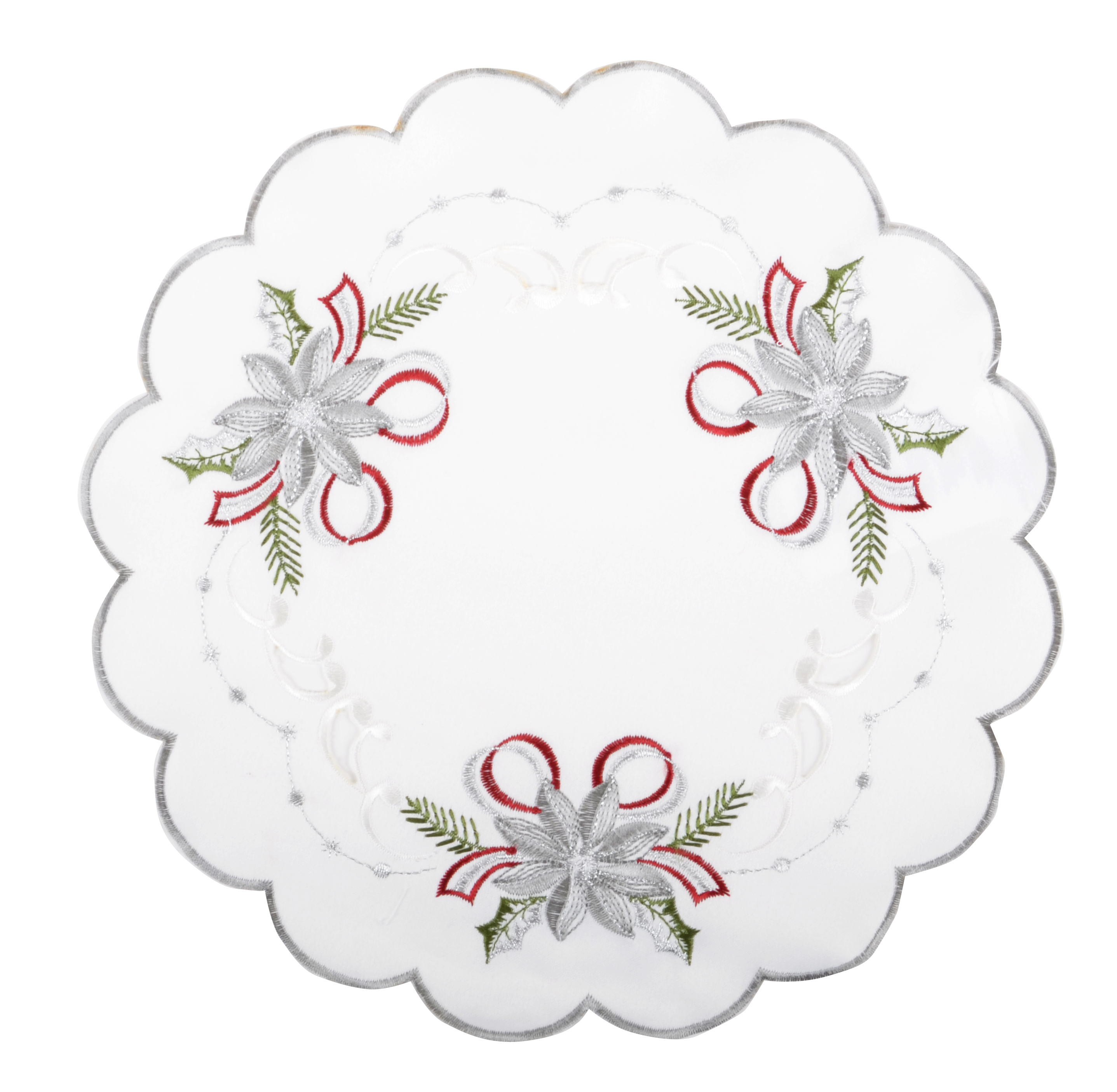 Vánoční ozdobný ubrousek s krásnými vyšívanými vánočními motivy v O 30 cm je důležitým doplňkem pro váš vánoční stůl.