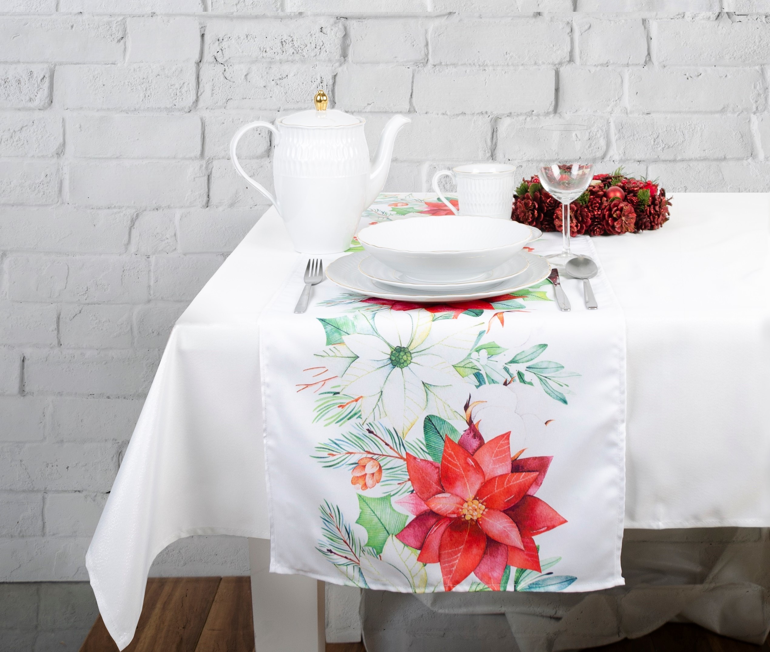 Kvalitní elegantní ubrus- běhoun na stůl v moderním zimním designu. Běhoun na stůl je nabízen ve velikosti 40x140 cm. Ubrus je odolný vůči nečistotám, neabsorbuje vodu. Běhoun na stůl je všestranným a stylovým doplňkem Vaší jídelny.
