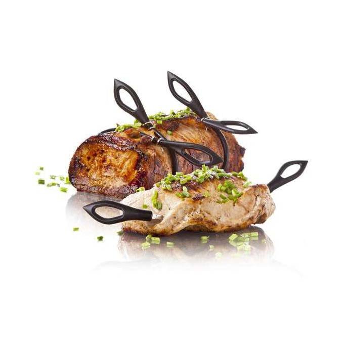 Také se trápíte s párátky a kuchyňskou nití při přípravě masové rolády či zavitků ? Posuňte své vaření na profesionální úroveň, dopřejte si excelentní a nanejvýš praktické pomocníky v podobě silikonových smyček opatřených kovovými háčky, které spolehlivě zpevní roládu jakéhokoli tvaru a praktické jehly zakončené silikonovými úchyty, takže při servírování se nebudete muset bát o své hosty, tyto jehly je opravdu snadné ze servírovaného jídla vyjmout. Již nebudete muset počítat párátka, kterými jste prošpikovali kuřecí závitek plněný sušenými rajčaty či se obávat, že vaše pracně připravená masová roláda vyjde z trouby v podobě, která neodpovídá vaším představám.