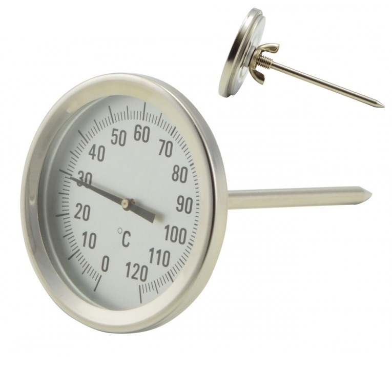 Teploměr PERFECT je navržen tak, aby měření probíhalo přímo uvnitř udírny, ne pouze u dvířek, kde může být teplota zkreslená ochlazováním okolním vzduchem. Díky prodlouženému hrotu snadno provrtáte dvířka udírny a pevně teploměr upevníte pomocí matky, čímž zajistíte stabilní a spolehlivý provoz.