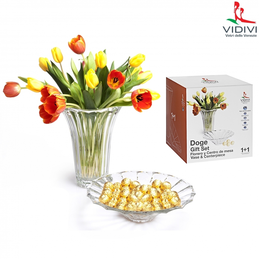Skleněná sada váza + mísa v benátském barokním stylu vyniká velmi silným sklem a vnějším zdobením dlouhými fazetami. Je to ideální luxusní dárek pro každého. Jsou vyrobené z kvalitního luxusního italského skla(sklo z Benátek) s vysokým stupněm transparentnosti, lesku a pevnosti. Propracované výrobky se budou vyjímat na každém stole. Vidivi výrobky vynikají jednoduchostí, čistotou tvarů, pevností a robustností. Rozměr - Ø 22,5 cm, výška - 30 cm a Ø 34 cm, výška - 9 cm, hmotnost - 5,370 kg , vhodné do myčky