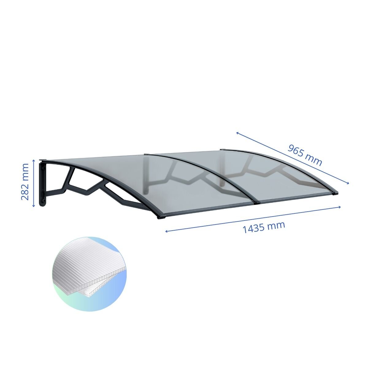 Stříška nad vchodové dveře, okna či jako přístřešek na terasu, balkón a nebo nad cestičku u budovy, instalační rozměry 96,5x143,5cm, v transparentní barvě z komůrkového polykarbonátu.
