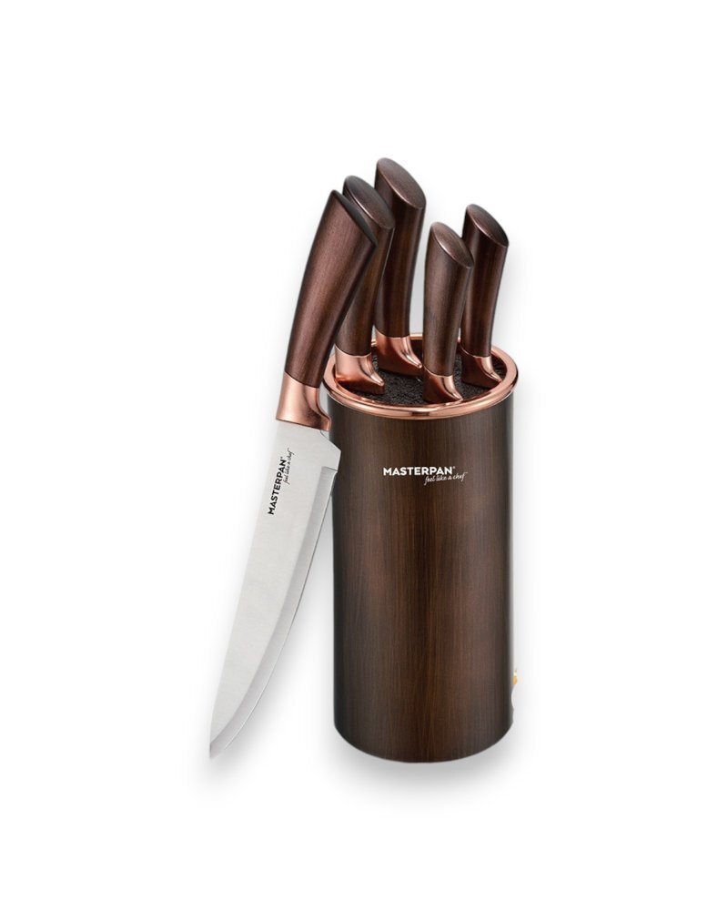Sada kuchyňských nožů s plastovým stojanem a zlatým měděným dekorem – 6 ks