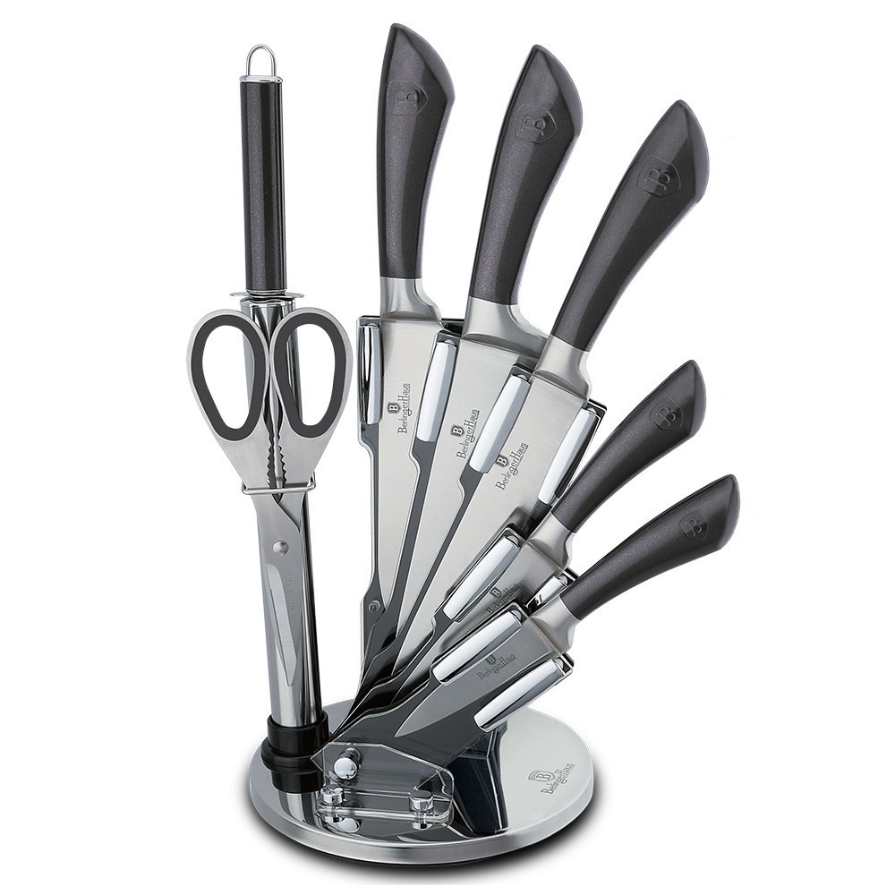 Sada nožů v otočném stojanu z nové kolekce Carbon PRO Line. Ty nejpoužívanější kuchyňské nože, nůžky a také ocílka v přehledném stojanu, který je navíc dokonalým designovým doplňkem do kuchyně. Tvrdá nerezavějící ocel zajistí dlouhou životnost. Konkrétně je celá sada nožů vyrobena z nerezové oceli typu 3CR13 Shanghai, ta má vyšší intenzitu, tvrdost a odolnost proti opotřebení nebo zlomení. Nože jsou kované z jednoho kusu oceli a jejich čepel je navíc vybroušena laserem pro maximální ostrost. Součástí sady je i ocílka na broušení, pokud je tedy potřeba, nože máte opět perfektně ostré během pár sekund. Stojan je celootočný o 360°, takže jej můžete umístit jakýmkoliv směrem a nože máte vždy po ruce přesně tak, jak vám to nejlépe vyhovuje.