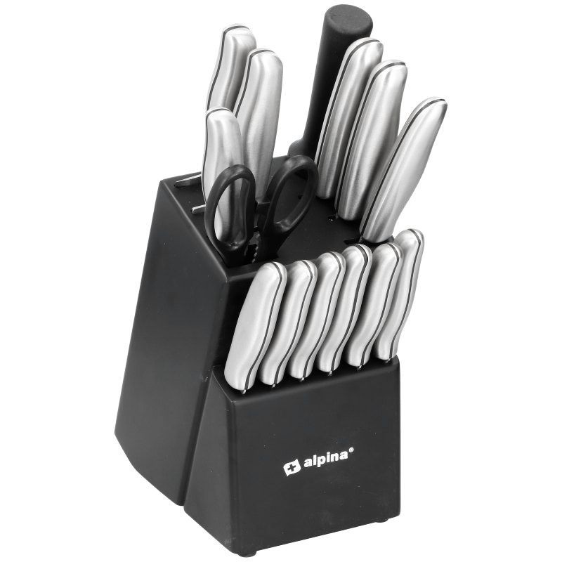 Blok nožů je nutností pro každého hobby kuchaře. Kompletní 15dílný blok nožů obsahuje: 12 nožů, 1 ostřič nožů a domácí nůžky. Tento dobře osazený blok na nože značky Alpina má jednoduchý vzhled a udělá dobrý dojem na každé pracovní desce.