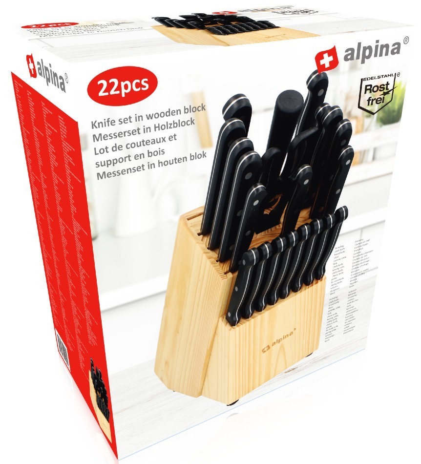 Tato rozsáhlá 22dílná sada nožů od alpina je obohacením vaší kuchyňské linky. Ve vaší kuchyni bude vypadat skvěle, všechny vaše krájecí nástroje budou skladovat kompaktně, přehledně, bezpečně a bezpečně a má dobrý poměr ceny a výkonu. Kromě toho je sada velmi kompletní, takže máte pro každý pokrm správné kuchyňské náčiní. Pro všechna řezná použití. Sada se skládá z dřevěného bloku na nože s gumovými nožkami na spodní straně pro dodatečnou stabilitu a ochranu. Blok obsahuje velkou rozmanitost celkem 18 nožů a 3 dalších kuchyňských potřeb. Máte tedy vše, co potřebujete ke krájení chleba, ovoce, zeleniny, bylinek, sýrů, masa, ryb a drůbeže. Výhodou několika nožů je také to, že pro pokračování nemusíte používaný nůž mezi nimi čistit. Tímto způsobem si nemusíte dělat starosti s přenosem chuti, protože pro každou operaci máte jiný nůž. S touto velmi kompletní sadou máte k dispozici velmi kompletní sadu: Blok na nože, kuchyňské nůžky, ocílka, vidlička na maso, nůž na sýr, 2 druhy kuchařských nožů, nůž na chléb, loupací nůž, zeleninu, vykosťovací nůž, kuchyňský nůž, 8 steakových nožů. Šéfkuchařský nůž a Santoku Kuchařský nůž, známý také jako kuchařský nůž, je nejvšestrannější nůž v kuchyni. Používají se na krájení masa, ryb, zeleniny a koření. Nůž má širokou čepel a je poměrně dlouhý, takže můžete provádět dobré řezné pohyby a stříhat relativně mnoho současně. Tato sada obsahuje 2 evropské kuchařské nože: délka 1 z 27 centimetrů, druhá cca 32 centimetrů. Součástí dodávky je také santokumes (délka cca 28,5 centimetrů). Santokumes pochází původně z japonské kuchyně a je asijskou verzí kuchařského nože. Japonský nůž je velmi univerzální a má zvláštní tvar. Čepel je o něco širší a méně špičatá. Vroubky na čepeli zajišťují, že přísady méně přilnou k ostří. Porcovací nůž. Tranšovací nůž, známý také jako nůž na maso, má menší šířku než kuchařský nůž. To je užitečné při krájení masa, ryb a drůbeže. Díky užší čepeli lepí kousky méně pevně, což usnadňuje krájení masa a nakrájí ho na hezčí plátky. Tento nůž tvoří společně s dodávanou vidličkou / vidličkou na maso (délka cca 28,5 centimetrů) řeznou sadu. Tuto sadu můžete použít na stole pro krájení pokrmu. Nůž na chleba. Výrazný zoubkovaný ostří a dlouhá čepel tohoto velkého nože zajišťují, že dostanete krásné plátky chleba. Praktické, pokud chcete upéct vlastní chléb nebo nakrájet bagetu na kousky. Samozřejmě se tento nůž hodí také na krájení koláčů a koláčů. Hodí se dokonce ke krájení různých druhů ovoce s tvrdší vnější stranou a měkkou vnitřní stranou, jako např. meloun, ananas nebo citrusové plody. Nůž na ovoce a zeleninu Pro menší pohyby krájení jsou škrabka a nůž na zeleninu šikovné a mnohostranně použitelné. Nůž na zeleninu (cca 19,5 centimetrů) je o něco větší než škrabka (cca 18 centimetrů). S oběma loupáme ovoce a zeleninu a nakrájíme je na malé kousky. Tyto malé nože se hodí také na ozdobu. Vykosťovací nůž (asi 27 centimetrů dlouhý) má ostrou špičku a pomáhá vám krájet maso z kostí a stáhnout kůži. Lze jej také použít k rozdělení větších kusů masa na krásné porce. Nůž na sýr, rajčata a klobásy. Nůž na sýr (délka asi 23 cm) se zoubkovanou a dělenou čepelí můžete snadno nakrájet přísady s tvrdou vnější stranou a měkčí vnitřní stranou, jako některé druhy sýrů. Můžete jej také použít na krájení rajčat a klobás. Nakrájený sýr nebo klobásu lze na konci napíchnout na vidličku. Steakový nůž Položte 8 steakových nožů vedle talířů na stůl. Mají celkovou délku asi 22,5 centimetrů. Jejich speciální konstrukce usnadňuje krájení pevného masa. Nože zajistí, že nemusíte vyvíjet velký tlak, abyste steaky nakrájeli na krásné kousky. Ocílka. Aby vaše nože byly ostré, je přiložena také ocílka (délka asi 31,5 centimetru). Tak můžete malé nerovnosti tak říkajíc. Kuchyňské nůžky jsou užitečné pro mnoho věcí. Speciálně pro úkoly v kuchyni si lze představit, že krájíme bylinky, zeleninu a dokonce tenké kousky masa a ryb, jako je šunka a uzený losos. Velmi odolný materiál. Kuchyňské potřeby jsou vyrobeny z ušlechtilé oceli a POM nebo polyoxymetylenu. Nerezová ocel např. v čepeli nožů zajišťuje odolnost proti korozi a hygienu. Rukojeti / rukojeti jsou z POM, silného, tvrdého a tvarově stabilního plastu s velkou elasticitou, který absorbuje silné nárazy a vibrace. Stručně řečeno, velmi odolný materiál.
