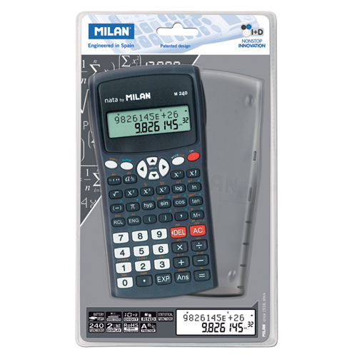 Vědecká kalkulačka MILAN s 2-řádkovým displejem, (10 + 2 číslice). Napájení zajišťuje 2x AAA baterie (jsou součástí). 240 integrovaných funkcí včetně 124 vědeckých funkcí. Trigonometrické funkce, parabolické a hyperbolické funkce a výpočet až 6 různých typů regrese; paměť na ukládání průměrů. Automatický výpočet zlomků, kurzorové klávesy pro pohyb v nabídkách, struktura závorek umožňující až 24 úrovní, paměť pro ukládání proměnných, výpočty pomocí stupňů, stupňů a radiánů.
