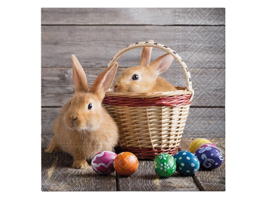 Papírový velikonoční ubrousek. Krásné velikonoční ubrousky s obrázky králíčků, kraslic a košíku dodají prostřenému stolu nádech přicházejícího jara a vykouzlí příjemnou atmosféru u slavnostního oběda nebo večeře. Ubrousek je kvalitní z třívrstvého papíru. Vhodný i na ubrouskovou techniku a různé dekorace.