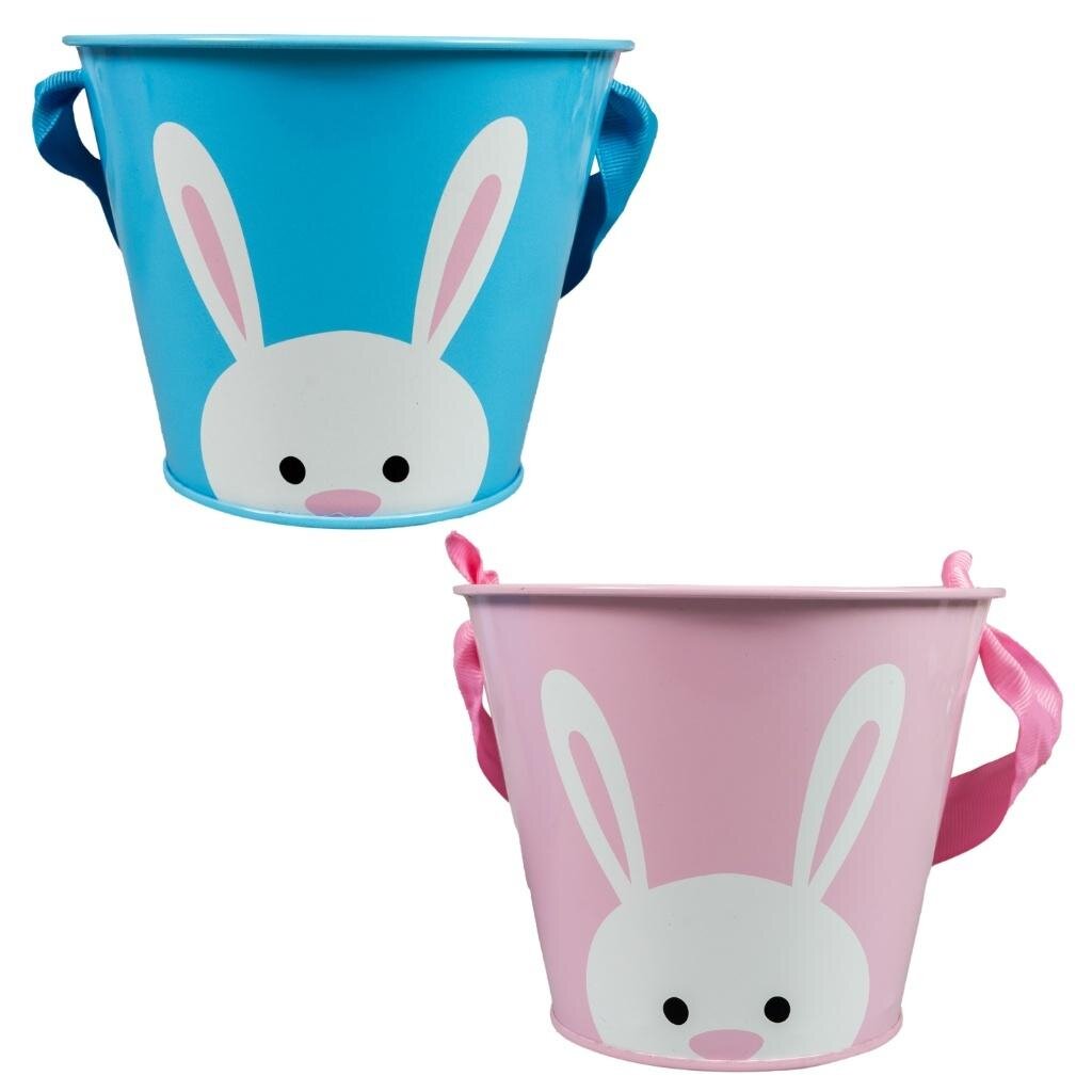 Metalowe wiaderko dekoracyjne to uroczy element wielkanocnych aranżacji. Dostępne w pastelowych kolorach - niebieskim lub różowym - z uroczym nadrukiem białego zajączka z dużymi uszkami. Wiaderko posiada pasującą kolorystycznie tasiemkę. Idealne jako pojemnik na słodycze, kwiaty lub dekoracje....