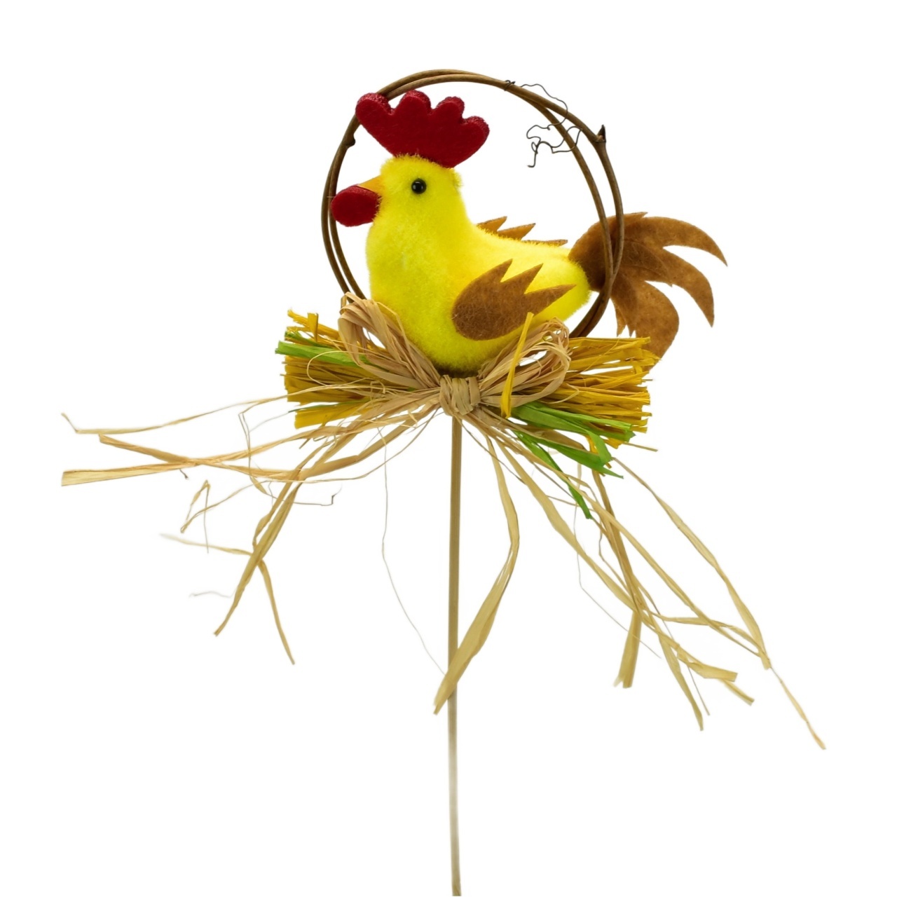 Ozdobte svůj domov s tímto stylovým zápichem kohoutka na otýpce, který se skvěle hodí jako velikonoční dekorace. Tento jedinečný kousek je umístěn v proutěném okénku, které mu dodává kouzelný přírodní vzhled. S výškou 35 cm a šířkou 9 cm (včetně špejle) je perfektní pro vystavení na vaší zahradě nebo na okenním parapetu.