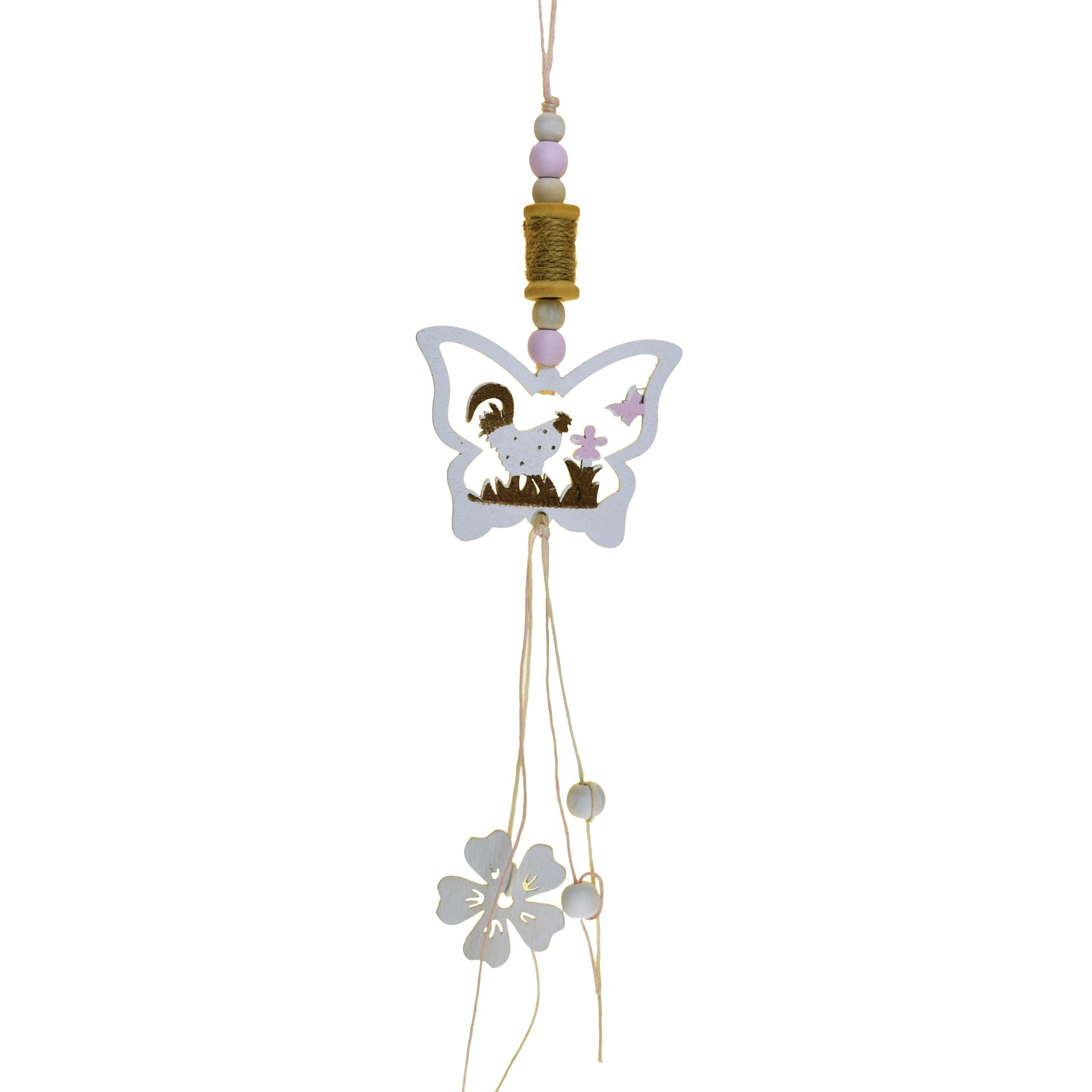 Motýlek se slepičkou na zavěšení je elegantní a dekorativní prvek, který obohatí váš interiér i exteriér. Tento dřevěný závěs je precizně vyroben z překližky a spojuje v sobě romantický styl s přírodní krásou.