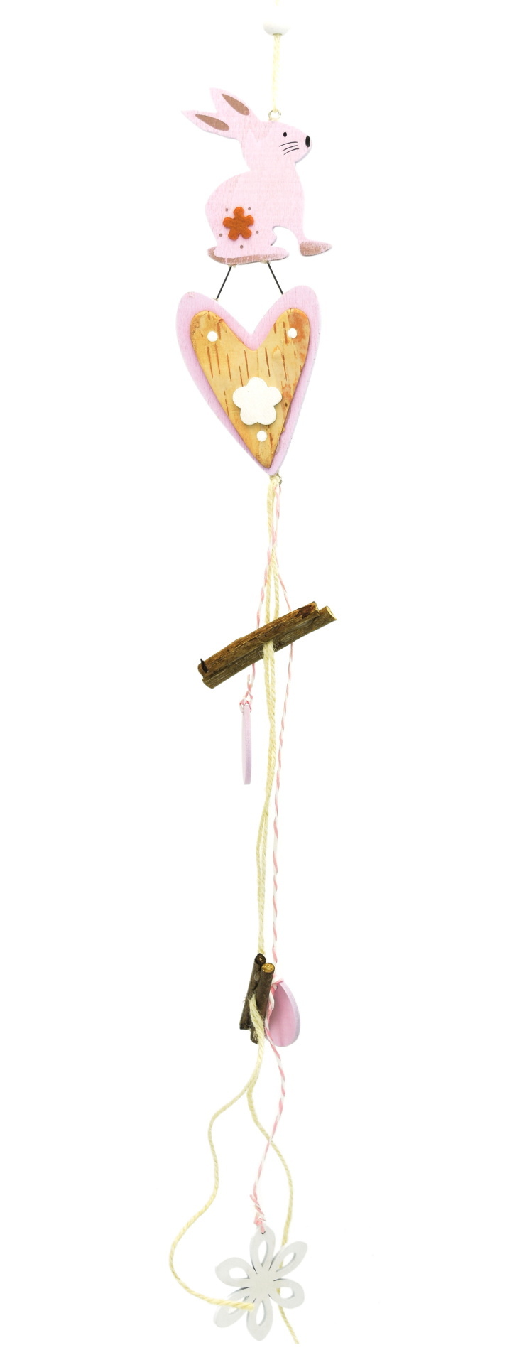Dřevěná závěsná dekorace ve tvaru zajíčka se srdíčkem přináší do vaší domácnosti kouzlo jara a osvěžující atmosféru Velikonoc. Tato elegantní dekorace je vyrobena z dřeva a vyniká svými jemnými barvami: růžovou a bílou, které harmonicky doplňují interiér.